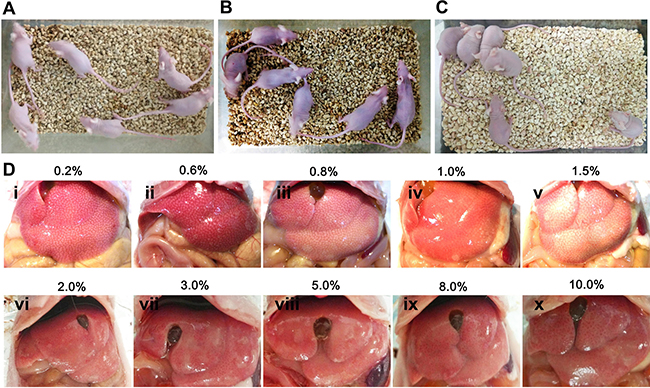 Figure 3: The establishment of mouse liver injury model by carbon tetrachloride. (A) Nude mice without carbon tetrachloride served as controls. (B, C) Nude mice were injected with different concentrations (0.2%–10%) of carbon tetrachloride. (D) Different levels of liver damage and necrosis by various concentrations (0.2%–10%) of carbon tetrachloride were visible under the macroscope.