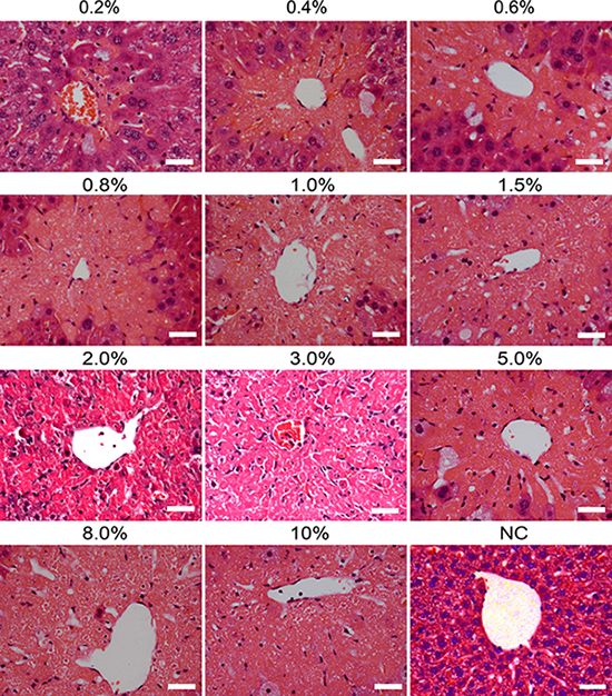 Figure 4: Histological changes in liver tissues of mice induced by different doses of carbon tetrachloride. Hematoxylin and eosin (H&E) staining showed the lesion of livers of mice with different concentrations (0.2%–10%) of carbon tetrachloride. Mice treated without carbon tetrachloride were used as a negative control (NC). Scale bars = 50 μm.