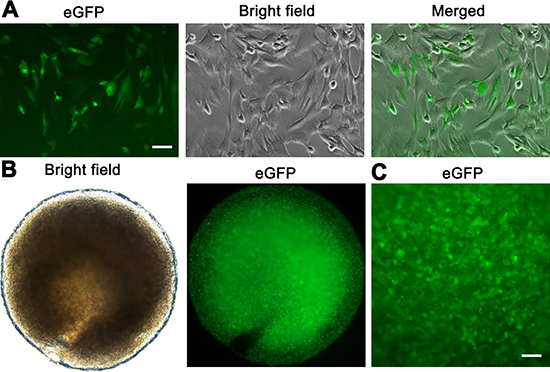 Figure 6: The recombination of human SSC line and mouse liver mesenchymal cells. (A) The eGFP expression was seen in human SSC line. Scale bar = 20 μm. (B, C) Cell recombinants including human SSC line and mouse liver mesenchymal cells were incubated in collagen gel. The eGFP fluorescence (B, left panel, and C) was seen in the recombinants showing substantial numbers of human SSC line and a homogeneous distribution. Scale bar in C = 50 μm.