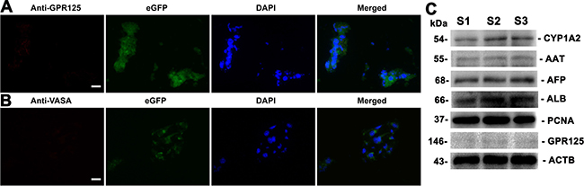 Figure 9: The expression of germ cell and hepatic markers in the grafts derived from human SSC line and mouse liver mesenchymal cells. (A, B) Immunohistochemistry showed the expression of GPR125 (A) and VASA (B) in the grafts derived from human SSC line plus mouse liver mesenchymal cells. Scale bars in A and B = 20 μm. (C) Western blots displayed the expression of CYP1A2, AAT, AFP, ALB, PCNA, and GPR125 in the grafts generated from human SSC line and mouse liver mesenchymal cells. Notes: S1, S2 and S3 represented three different samples. ACTB served as a loading control of proteins.
