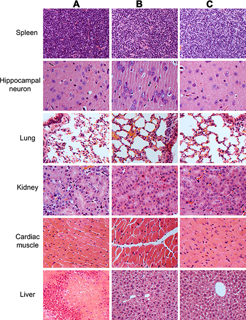 Figure 11: The histological observations of the organs and tissues in mice transplanted with human SSC line and mouse liver mesenchymal cells, mice with liver injury, and the normal nude mice. Notes: organs and tissues from mice with liver injury by carbon tetrachloride induction (A), as well as organs and tissues from mice at 4 weeks after transplantation of human SSC line and mouse liver mesenchymal cells (B), and organs and tissues from normal nude mice (C).