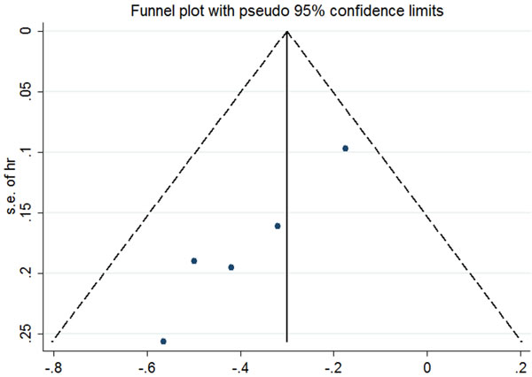 For ES-SCLC patients, the median natural survival is only 2-4 months [31] and there are virtually no long-term survivors [32]. Combination chemotherapy of etoposide and platinum has improved short-term survival, but long-term survival remains frustrating. The 2-year survival rate among patients with ES-SCLC has risen by only 3.1% from 1.5% in 1973 to 4.6% in 2000 [33]. In 1999, Jeremic et al published the results of a study in which patients with ES-SCLC achieving extrathoracic CR after chemotherapy and either CR or PR inside the thorax were randomized into two groups: prophylactic cranial irradiation (PCI) plus chemotherapy group versus PCI, TRT plus additional chemotherapy group. The eventual data found a significantly improved survival with the use of TRT [25]. Recent results from the CREST trial have given rise to a large scale worldwide debates [16]. The study showed that in ES-SCLC patients with any response after chemotherapy, TRT led to a significant improvement in PFS (P < 0.001). Although the 1 year-survival difference between two groups (TRT arm 33% vs. no TRT arm 28%) failed to reach the expected 10%, a significant difference was observed in 2-years OS (TRT 13% vs. no TRT3%). Meta-analysis of Jeremic ‘s study and the CREST study further addressed the value of TRT in ES-SCLC patients receiving EP chemotherapy. Final result indicated that the use of TRT was associated with improvement in both OS and PFS with hazard ratios(HRs) of 0.81(95% confidence interval [CI], 0.69-0.96) and 0.74(95%CI, 0.64-0.87), respectively [34]. This remarkable outcome might result from more chances for patients to receive salvage treatment after failure to first-line therapy. To our knowledge, there have been 7 studies comparing the OS of ES-SCLC patients receiving TRT or not [14, 16, 20, 22, 25, 29, 30], among of which only 5 studies have available data [14, 16, 25, 29, 30]. After a comprehensive and quantitative assessment, we carried out a meta-analysis of these 5 studies and found a significant relationship between TRT and OS. The addition of TRT was associated with a significant improvement in OS (fixed-effects model HR, 0.72; 95% CI, 0.62-0.82; P < .0001). Heterogeneity testing was negative (Q = 4.26, df = 4, P = .372, I2 = 6.1%), and the OS result remained significant in the sensitivity analysis (Figure 1). We had applied sensitive search strategies and rigorous inclusion criteria to minimize the potential publication bias. According to the funnel plot, no significant asymmetry was detected for our outcome (Figure 2).