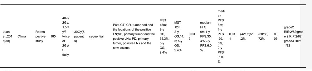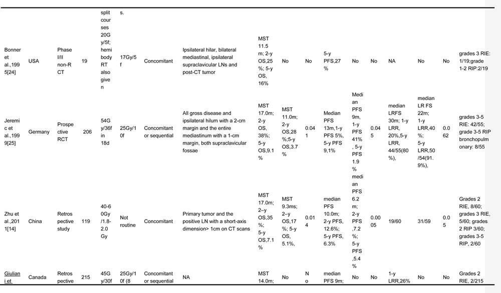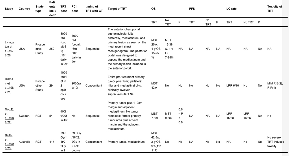 TRT, thoracic radiotherapy; ES-SCLC, extensive stage small cell lung cancer; OS, overall survival; PCI, prophylactic cranial irradiation; CT, chemotherapy; OS, overall survival; PFS, progression free survival; LC, local control; f, fraction; w, weeks; MST, median survival time; NA, no available; LN, lymph node; LRR, local relapse rate; RIE, radiation induced esophagitis; RIP, radiation induced pneumonitis; RCT, randomized controlled trial; y, year; LRFS, local relapse free survival; GTV, gross tumor volume; CR, complete response; SD, stable disease; PD, progressive disease
