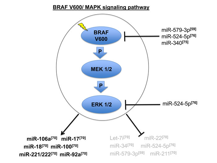 The RAS-RAF-MAPK signaling pathway has a central role in sustaining the oncogenic and proliferative phenotype of melanoma cells, as well as in other human cancers [67]. For this reason, miRNA involvement in the regulation of this pathway has been the focus of intensive research efforts. Let-7 was the first miRNA to be described to directly target KRAS, one of the most important members of MAPK pathway, frequently mutated in human cancers [68]. Furthermore, polymorphisms in KRAS 3’UTR alter let-7 binding, thus resulting in the aberrant activation of the MAPK pathway in non-small cell lung cancer [68]. On the reverse MAPK activity results in the aberrant expression of a subset of miRNAs in pancreatic cancer cells. Four miRNAs: miR-7-3, miR-34a, miR-181d, and miR-193b, have been preferentially associated with MAPK activity [69]; in particular that the promoter of host genes for miR-7-3 and mir-34a are both downregulated by the constitutive activation of MAPK [69]. Therefore there seems to be a reciprocal capability of selected miRNAs to regulated of MAPK pathway and viceversa.