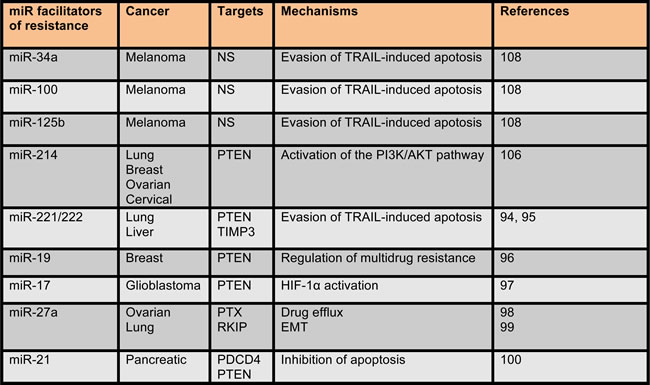 miRNAs, which act as facilitators of the establishment of drug resistance in human cancers, are listed in the table. Not shown (NS) indicates that in the corresponding studies no information about miRNAs target genes have been mentioned.