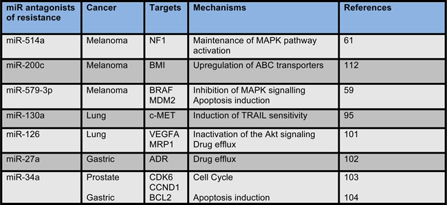 Table 4: microRNAs antagonists of drug resistance in human cancers.
