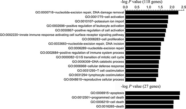 GO analysis allowed us to group the affected genes according to their biological processes, providing new insights into tumor metastasis. Our proof-of-principle screen indicated that several genes had strong prognostic significance for advanced ovarian tumors. A previous study indicated that the expression of immune response genes was elevated and survival was significantly lower in patients with high-grade serous and endometrioid tumors than in those with low-grade/low-malignant-potential tumors [29]. While the amplification of groups of defense response genes in the TCGA database, as well as immune system and immune cell activation genes, was associated with worse OS in our study, the differences were not significant. Immune responses have long been considered important events in tumor progression. Thus, it is necessary to further explore the behavior of ovarian cancer in the context of immune responses.