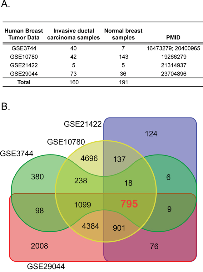 Figure 1: The human breast tissue data sets used in this study. A. Four independent gene transcript data sets containing invasive ductal carcinoma and normal breast tissue samples were used. B. Differential expression of tumor versus normal using a fold-change cut-off of 1.5 and adjusted p-value 0.01 identified the 795 common probe ID set.