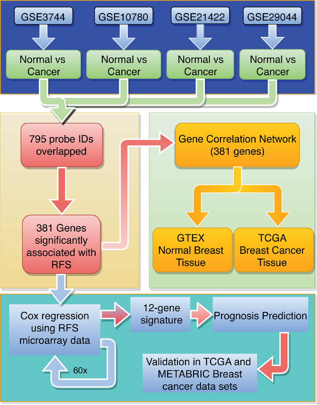 Figure 2: Flow diagram for identifying and validating a prognostic biomarker panel for breast cancer. The 795 robustly deregulated probe IDs were identified using 4 breast tumor microarray data sets (blue). To identify individual genes associated with relapse-free survival (RFS), Kaplan Meier survival analysis was run on the overlapping IDs (yellow). A gene expression correlation network approach was used to identify cliques of functionally related genes (green). Cox regression was run on 60 random tumor samples for 381 genes significantly associated with RFS (turquoise) to generate the 12-gene signature. The 12-gene signature was used to generate a prognosis scoring system, which was validated using the TCGA and METABRIC BC data sets.