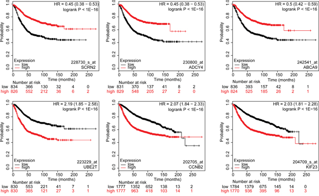 Figure 3: Kaplan-Meier survival curves for breast cancer patients according to tumor expression of genes with highest and lowest hazard ratios. The breast cancer patient cohort was divided into two equal groups based on median expression for each gene and compared by a Kaplan-Meier survival analysis. The estimate of the hazard ratio (HR) and log-rank p-value of the curve comparison between the groups is shown. Top three genes with the lowest HR values (top row): SCRN2, ADCY4 and ABCA9. Top three genes with the highest HR values (bottom row): UBE2T, CCNB2 and KIF23. Low and high risks indicated in black and red, respectively.