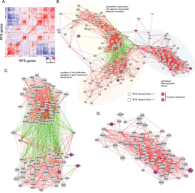 Figure 4: Visual representation of correlations in gene expression in normal human breast tissue samples. A. The heat map shows the correlation in gene expression between normal breast tissue samples obtained from GTEX. Positive correlations are indicated in red, while negative correlations are indicated in blue. B. Gene expression correlation network of RFS significant genes in normal breast tissue samples. Individual genes are indicated as nodes. Red edges indicate a positive correlation in gene expression (r ≥ 0.6) between two genes. Green edges indicate a negative correlation in gene expression between two genes (r ≤ -0.6). Labels indicate significant biological enrichment (adjusted p-value<0.05). Pink colored genes are present in the 12-gene prognostic signature. Three major functional cliques were separated based on gene-ontology. Clique 1 (yellow): cytoskeleton organization, cell substrate organization, and metabolic processes. Clique 2 (orange): regulation of cell proliferation, regulation of gene transcription, and cell adhesion. Clique 3 (blue): ell division, DNA replication, and mitosis. Genes with hazard ratio for RFS >1 are indicated as circles and those with HR<1 as squares. C. Enlargement of negative correlations and the genes associated with them. D. Enlarged cell division, DNA replication, and mitosis clique.