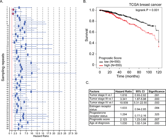 Figure 6: A 12-gene signature predicts breast cancer patient prognosis. A. For each of 60 test sets the hazard ratio and the 95% confidence interval was calculated using a Cox model based on the prognostic score with groups as covariates, and subsequently plotted in a forest-plot diagram. The red line indicates a HR value of 1, or the null hypothesis. The two red boxes indicate the insignificant trials (confidence interval included HR value of 1) B. Kaplan-Meier overall survival curve for breast cancer patients according to prognostic score using the 12-gene signature. The BC patient cohort was divided into two equal groups based on the prognostic score. The log-rank p-value of the curve comparison between the groups is shown. C. The hazard ratio and the 95% confidence interval was calculated using a Cox model based on tumor stage (I-IV), estrogen receptor and progesterone receptor status, age at diagnosis and prognostic score as covariates.