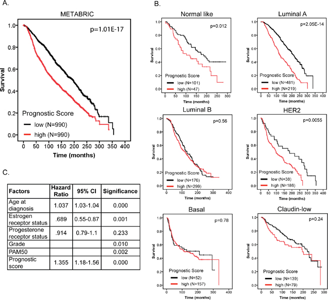 We further validated our 12-gene prognostic signature in a second independent breast cancer dataset consisting of 1980 BC patients and containing data for individual breast cancer molecular subtypes (METABRIC; [17, 18]). Prognostic scores for all 1980 patients were calculated as described above for the TCGA cohort and patients were ranked based on their score and divided into two equal sized cohorts. Kaplan-Meier analysis revealed a significant difference between the two patient cohorts (Figure 7A; p=1.01E-17). To address the interaction of our signature with breast cancer molecular subtypes we stratified our patient cohort by molecular subtype (based on PAM50; [19]) and used Kaplan-Meier analysis to investigate differences in survival between the low and high prognostic score cohorts. We found that higher prognostic score was significantly associated with shorter survival in “normal-like”, “luminal A” and “HER2” subtypes (Figure 7B). To determine, in this data set, if our prognostic score was independent of age at diagnosis, tumor grade, estrogen- and progesterone-receptor status and molecular subtype (PAM50) we ran multivariate Cox regression force-entry with these factors including the prognostics scores as covariates. We further confirmed that our prognostic signature has clinical validity independent of age at diagnosis, estrogen receptor status, tumor grade and molecular subtype.