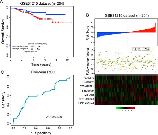 Figure 1: Performance evaluation of the seven-lncRNA signature in the training dataset. (A) Kaplan-Meier survival curves between high-risk group and low-risk group. (B) The distribution of risk score, patients’ survival status and expression patterns of lncRNA signature. (C) Five-year ROC curves of the seven-lncRNA signature.