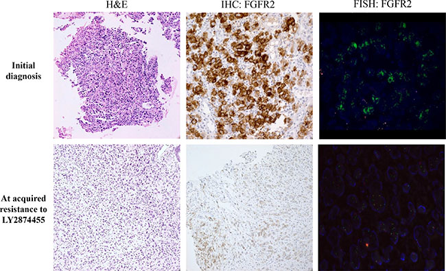 Figure 2: Pathology (hematoxylin & eosin staining, H&E), IHC, and FISH results in primary tumor tissues at the time of diagnosis (upper row) and at the time of acquired resistance to LY2874455 (lower row).