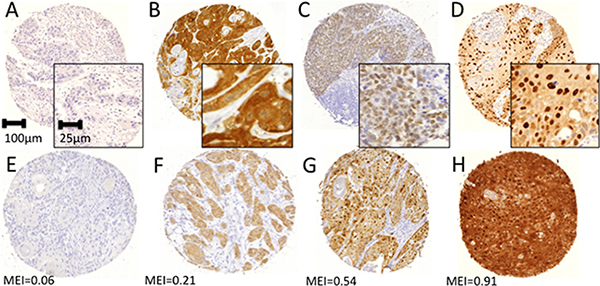 Figure 1: Representative immunohistochemical staining examples for pan-MAGE (M3H67). Different staining patterns were attributed visually by two independent observers. (A) Negative sample, (B) cytoplasmic expression, (C) nuclear expression, (D) combined cytoplasmic and nuclear expression. Digital pathology was used to determine the expression intensity of each core. Examples for different expression intensities are presented with the respective mean expression intensity indicated below (E–H).