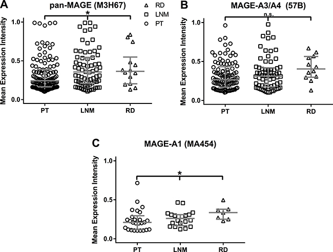Figure 2: Mean Expression Intensities (MEI) in samples of primary tumors (P), lymph node metastases (LNM) and recurrenct disease (RD). All available samples with a MEI ≥ 0.1 were included in this analysis. MEI values are shown for each triplicate. The horizontal bar indicates the median MEI, the vertical bars indicate the interquartile range. Median MEI were as follows: Pan-MAGE: P = 0.24 (n = 120), L = 0.36 (n = 68), R = 0.37 (n = 14). MAGE-A3/A4: P = 0.27 (n = 101), L = 0.31 (n = 67), R = 0.40 (n = 12). MAGE-A1: P = 0.21 (n = 26), L = 0.26 (n = 20), R = 0.33 (n = 7). By Kruskal Wallis test the median MEI were different for pan-MAGE (p = 0.018) and MAGE-A1 (p = 0.041), but did not reach significance for MAGE-A3/A4 (p = 0.111).
