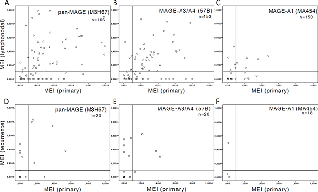 Figure 3: Scatter plot of Mean Expression Intensities (MEI) in paired samples. The available number of samples (n) is indicated. The threshold of MEI = 0.1 for primary tumors (PT) is indicated by a vertical bar and a horizontal bar for lymph node metastases (LNM) and recurrent disease (RD) respectively. MEI was compared in related samples using Wilcoxon signed rank test. (A–C) depict MEI of paired samples of PT and LNM. The median of differences between the MEI of PT and respective LNM was not different for (A) pan-MAGE (p = 0.900), (B) MAGE-A3/A4 (p = 0.594) or (C) MAGE-A1 (p = 0.601). (D–F) depict MEI of paired samples of PT and RD. Significant differences were observed for (D) pan-MAGE (n = 23, p = 0.034), (E) MAGE-A3/A4 (n = 20, p = 0.041), but not for (F) MAGE-A1 (n = 18, p = 0.144). The number of discordant samples in the upper left quadrant (PT = negative, RD = positive; pan-MAGE: 17.4%, MAGE-A3/A4: 25%, MAGE-A1: 16.7%) is higher than in the lower right quadrant (PT = positive, RD = negative; pan-MAGE: 4.3%, MAGE-A3/A4: 5%, MAGE-A1: 0%)).
