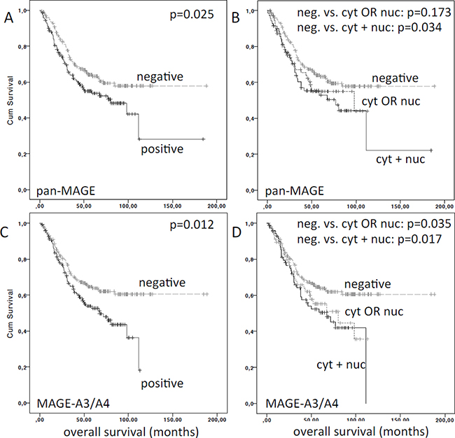 Next, we evaluated the impact of the respective expression pattern on OS. Compared to negative cases, OS for pan-MAGEcytORnuc (n = 73, mean OS=71.3 months) was lower, but did not reach significance (p = 0.173). In contrast, OS in pan-MAGEcyt+nuc (n = 70, mean OS=82.9 months) was significantly reduced (p = 0.034). Compared to negative cases, OS for MAGE-A3/A4cytORnuc (n = 67, mean OS = 68.6 months) was lower, but did not reach significance (p = 0.111). In contrast, OS in MAGE-A3/A4cyt+nuc (n = 71, mean OS=65.9 months) was significantly lower (p = 0.017) (Figure 4B, 4D).