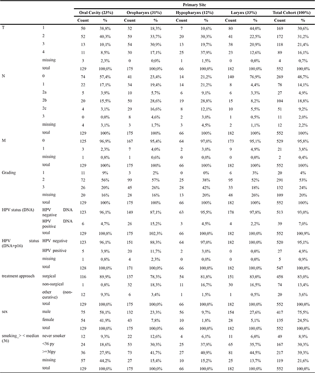 The cohort comprised 129 oral cavity, 175 oropharyngeal, 66 hypopharyngeal and 182 laryngeal primaries. Mean OS was 105.4 months, mean recurrence-free survival (RFS) was 82.2 months. The majority of patients were treated surgically (n = 458), 74 patients were treated by primary chemoradiation and 20 patients were treated with palliative intention. Clinico-pathological criteria of the patient cohort separately for each primary site can be found in Table 1.
