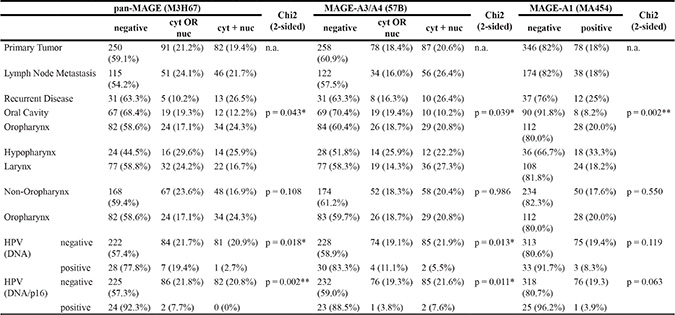MAGE expression frequency in primary tumors was significantly different based on the primary site for pan-MAGE (p = 0.04), MAGE-A3/A4 (p = 0.04) and MAGE-A1 (p = 0.002) whereas the lowest expression rate was found in oral cavity primaries and the highest expression rate in hypopharyngeal primaries. MAGE expression was less frequently found in HPV positive cases based on HPV-DNA for pan-MAGE (HPV-DNAnegative/pan-MAGEpositive: 165/387 (42.6%), HPV-DNApositive/pan-MAGEpositive: 8/36 (22.2%) p = 0.018) as well as for MAGE-A3/A4 (HPV-DNAnegative/MAGE-A3/A4positive: 159/387 (41.0%), HPV-DNApositive/MAGE-A3/A4positive: 6/36 (16.7%), p = 0.013). Based on HPV DNA and p16 status similar results were found for pan-MAGE (HPV(DNA+p16)negative/pan-MAGEpositive 168/393 (42.7%), HPV(DNA+p16)positive/pan-MAGEpositive 2/26 (7.7%), p = 0.002) and MAGE-A3/A4 (HPV(DNA+p16)negative/ MAGE-A3/A4positive 161/393 (40.9%), HPV(DNA+p16)positive/pan-MAGEpositive 3/26 (11.5%), p = 0.011). Detailed numbers including the distribution of the expression pattern for MAGE positive cases are provided in Table 2.