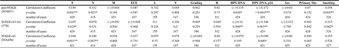 A Pearson correlation revealed significant correlations between pan-MAGE expression and T-classification, N-status, HPV-status and smoking, but all correlation coefficients were R < 0.2. For MAGE-A3/A4 a significant correlation was found with T-classification, HPV-status and smoking. All correlation coefficients were R < 0.2. MAGE-A1 was significantly correlated with T-classification, N-status and HPV-status. All correlation coefficients were R < 0.2. All correlation coefficients and significance values are provided in Table 5.