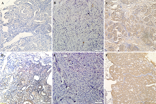 Figure 1: E2F-1 expression is correlated with pathogenesis and aggressiveness of ovarian carcinoma. E2F-1 expression in normal ovarian tissue (A and D) oviduct tissues (B and E) and ovarian carcinoma tissues (C and F) which was detected by immunohistochemistry.