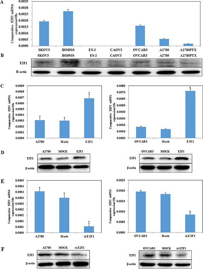 Figure 2: E2F1 expression in ovarian cancer cell lines. E2F1 mRNA and protein expression levels among ovarian cancer cell lines SKOV3, HO8910, ES-2, CAOVR3, OVCAR3, A2780 and A2780PTX were examined (A and B). Transfection of A2780 and OVCAR3 cells with the E2F-1 plasmid results in increased E2F-1 (C) mRNA and (D) protein expression, while silencing of E2F-1 reduces (E) mRNA and (F) protein expression.
