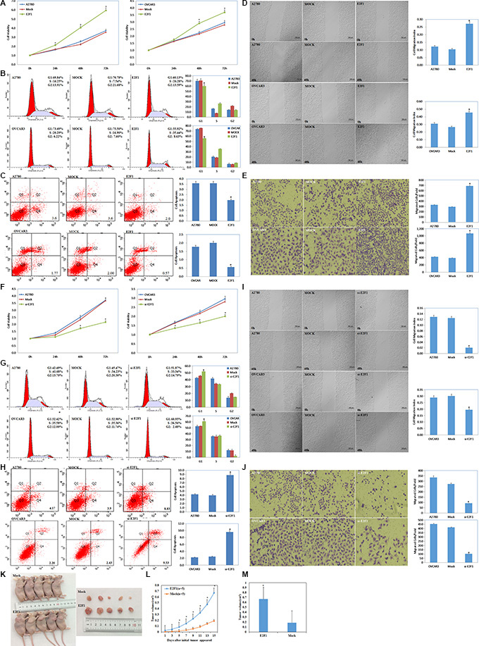 Figure 3: Effects of E2F1 on ovarian carcinoma in vitro and in vivo. Overexpression of E2F-1 (A) increased the rate of growth, (B) promoted G1/S progression, (C) decreased levels of apoptosis, (D) increased migration and (E) invasion ability. Knockdown of E2F1 exhibit significantly (F) decreased growth, (G) increased G1 arrest and (H) increased apoptosis, (I) lower migration and (J) invasion ability. Nude mice injected with cells stably expressing E2F-1 showed a dramatic increase in tumor size (K) and tumor xenograft (L) growth and (M) volum in vivo. Results are representative of three separate experiments; data are expressed as the mean ± standard deviation. *p < 0.05.