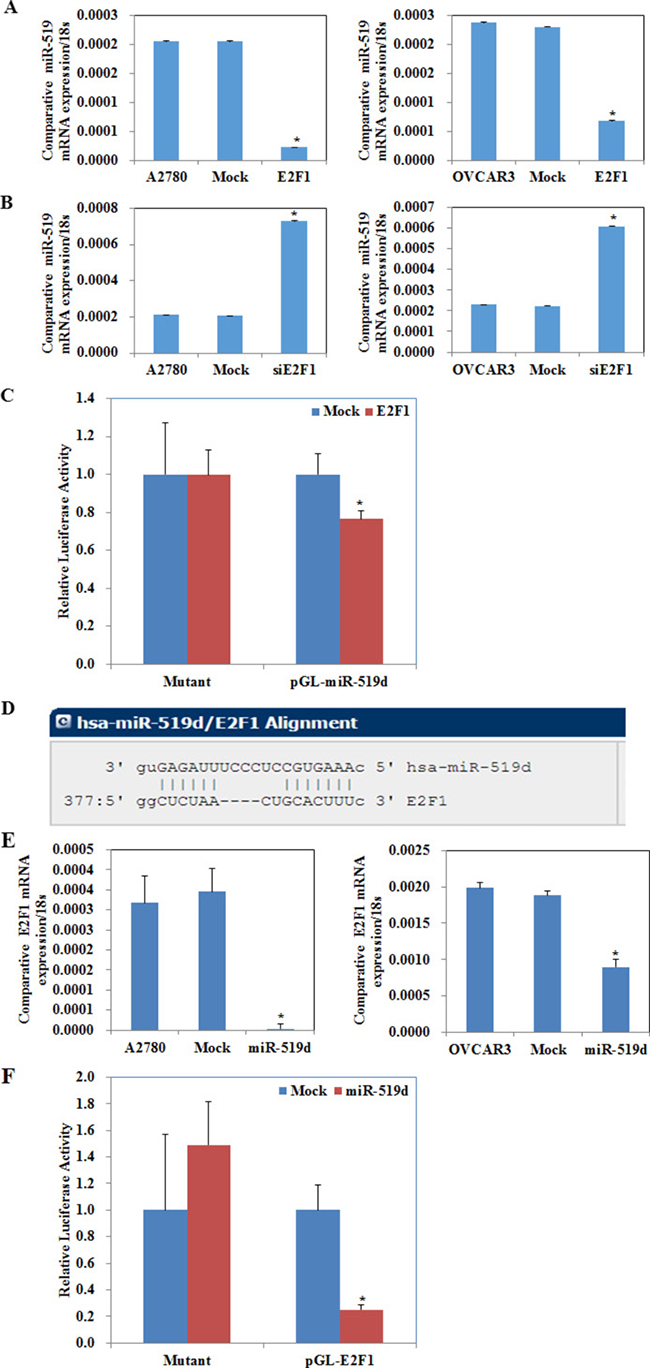 Figure 4: E2F1 downregulated miR-519d directly, and miR-519d downregulated E2F1 directly. (A) Overexpression of E2F-1 represses miR-519d mRNA expression. (B) Silencing of E2F-1 promotes miR-519d mRNA expression. (C) Luciferase reporter assays confirm that miR-519d is the target of E2F-1. (D) The microRNA.org website predicted that the E2F1 mRNA 3′ untranslated region (3′ UTR) contained miR-519d binding sites. (E) Overexpression of miR-519d represses E2F-1 mRNA expression. (F) Luciferase reporter assays confirm that E2F-1 is the target of miR-519d. *p < 0.05.