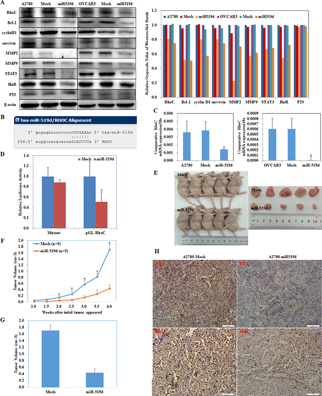 Figure 5: MiR-519d inhibits ovarian carcinoma and downregulates RhoC directly. (A) miR-519d transfection in A2780 and OVCAR3 cells downregulated RhoC, Bcl-2, cyclin D1, survivin, MMP2, MMP9, STAT3, and HuR expression. No changes were observed in p53 expression. (B) The sequence in the 3′UTR of RhoC complementary to the miRNA-519d seed region suggests that RhoC is a direct target of miR-519d. (C) miR-519d transfection reduces mRNA expression of RhoC. (D) Dual luciferase reporter assay indicated that miR-519d directly targets RhoC by binding its 3′UTR. Nude mice injected with cells stably expressing miR-519d showed a (E) dramatic reduction in tumor size and tumor xenograft (F) growth and (G) volumn. (H) miR-519d overexpression downregulates E2F1 and RhoC expression in tumor xenografts in vivo. *p < 0.05.