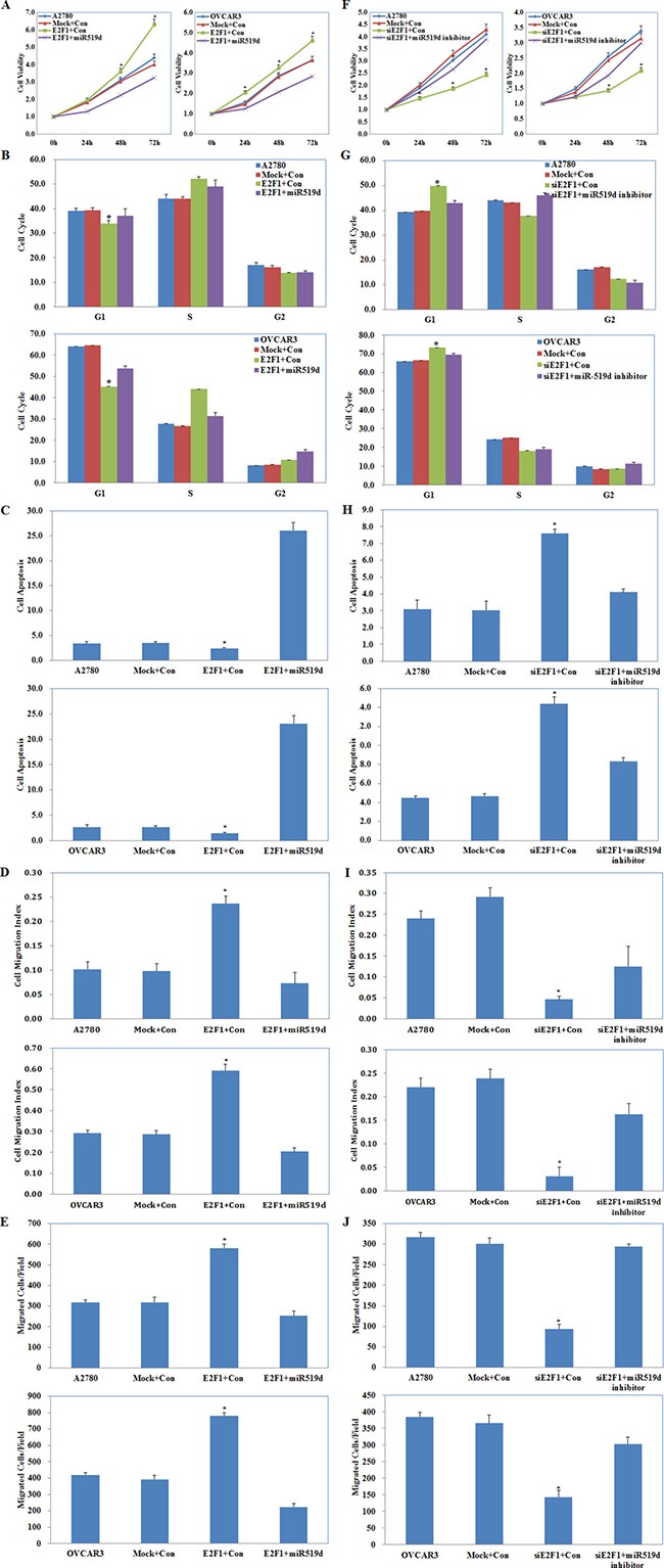 Figure 7: Effects of E2F1 and miR-519d co-transfection on ovarian carcinoma cells. E2F1 plasmid and miR-519d mimic co-transfection (Mock+Con stands for E2F1-mutant plus miR-519d contorl, E2F1+Con stands for E2F1 plasmid plus miR-519d control ) caused (A) severe growth retardation, (B) promoting G1–S progression, (C) high levels of apoptosis, and reduced (D) migration and (E) invasive ability. E2F1 siRNA and miR-519d inhibitor co-transfection (Mock+Con stands for siE2F1-mutant plus miR-519d inhibitor contorl, siE2F1+Con stands for E2F1 siRNA plus miR-519d inhibitor control ) exhibited (F) slower growth, (G) G1 arrest, (H) increased apoptosis, (I) decreased migration and (J) invasive ability. *p < 0.05. See Supplementary Figure 1.