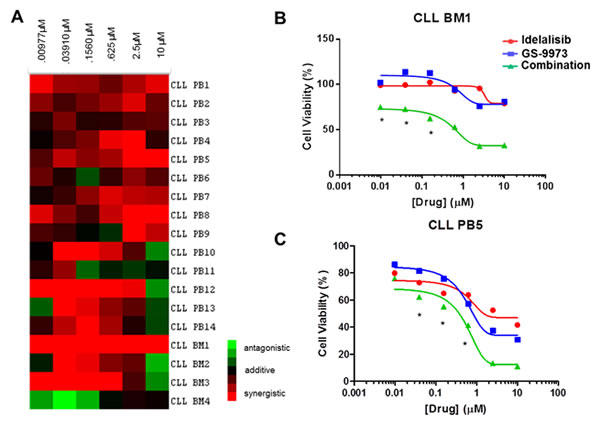 Figure 1: (A) A heat map displaying interaction indices at individual concentration points for each CLL sample. R values >1 (antagonistic), 1 (additive) and <1 (synergistic) are color coded as green, black and red, respectively. Specifically, the heat map was created using TreeView by transforming the interaction index for each concentration point of the primary samples by log2. Each row represents an individual sample. Peripheral blood samples are labeled “PB” and bone marrow samples are labeled “BM.” The columns represent (from left to right) increasing equimolar concentrations of each drug drug ranging from .977 nM to 10 μM. (B) A representative viability curve for CLL BM1 is shown with viability on the y axis and increasing equimolar concentrations of drug (μM) on the x axis. Resistance to each agent as monotherapy is seen (top 2 curves), an effect that is overcome by the drug combination (bottom curve) when the combination is used. (C)) Viability curve for a sample representative of having synergy. Although all concentrations of the drug combination were synergistic, (CI < 1), some concentrations had values that lost significance when accounting for the 95% confidence interval. Therefore, asterisks are provided which denote points that are significantly synergistic within the 95% confidence interval as defined by R. Idelalisib (GS-1101) treated cells are shown in red, GS-9973 in blue, and the combination in green.