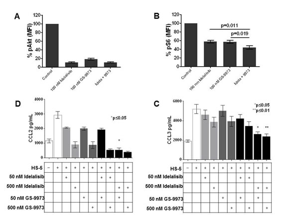 Figure 2: Treatment of primary CLL cells (n =14) co-cultured with HS5 stromal cells with idelalisib (100 nM) or GS-9973 (100 nM), alone or in combination (100 nM each), results in decreased AKT phosphorylation. (A) while treatment with the combination significantly decreases S6 phosphorylation as compared to treatment with each drug alone (p = 0.011 for the combination compared to GS-1101 treatment alone and p= 0.019 compared to GS-9973 alone). Each condition was compared using a two tailed t-test. (B)The effect of idelalisib (GS-1101) and/or GS-9973 on CCL2, CCL3, CCL4, and CCL22 expression after CLL-HS-5 co-culture. The bar diagrams represent the mean supernatant concentrations (+/- SEM) of CCL2 (C), CCL3 (D), CCL4 (E), CCL22 (F) from CLL cells co-cultured with or without (controls) HS-5 cells and various concentrations of idelalisib, GS-9973, or a combination of idelalisib and/GS-9973 (50 nM plus 50 nM, 50 nM plus 500 nM for each drug, and 500 nM plus 500 nM for each drug) in 6 different patient samples assessed after 24 hours. Chemokine expression after treatment with individual drug or the combination was compared using a two tailed t-test. The combination of idelalisib and GS-9973 showed significant effect on decreasing CCL2, CCL3 , CCL4 , CCL22. A single asterisk denotes significant (p < .05) and a double asterisk (**) represents a significance of p < .01. Differences between single agent treatment and the combinations are shown. Panels G-J show increased chemokine expression when CLL cells are cultured in the presence of primary bone marrow derived stromal cells (n=3). Similar to the HS5 co-culture system, co-culture with primary bone marrow leads to increased chemokine expression (mean +/- SEM supernatant concentrations) which is abrogated by treatment with idelalisib (100 nM) and GS-9973( 100 nM) for 24 hours. As shown in the last column in each figure, this effect that is significantly enhanced by combining these two agents (p < .05, two tailed t-test).