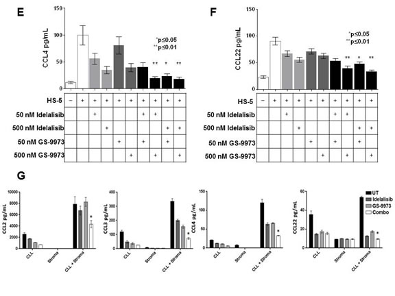 When CLL cells were co-cultured with HS5 stromal cells (n=6), significantly higher levels of CCL2, CCL3, CCL4 and CCL22 were seen (Figure 2). Combination treatment significantly decreased CCL2 (2C), CCL3 (2D), CCL4 (2E), CCL22 (2F) compared to each individual drug. To validate the results seen using the HS-5 co-culture system, we also tested the effects of idelalisib or GS-9973 on CLL cells cultured in primary BM stromal cells (n=3) and saw significant decreases in chemokine levels (Figure 2G) after idelalisib plus GS-9973 treatment.
