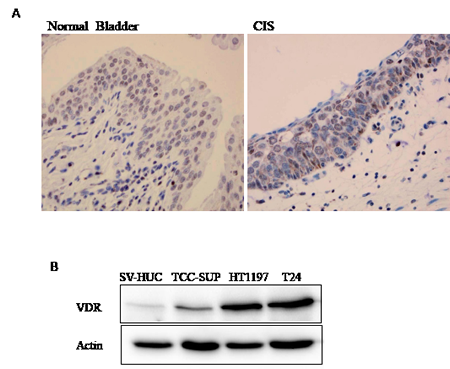 Figure 1: Detection of VDR expression in human bladder. (A) VDR protein expression was detected in human bladder tissues including benign bladder and bladder carcinoma in situ (CIS) by IHC staining. (B) VDR expression in bladder cell lines, including immortalized normal urothelial cell line SV-HUC and three BCa cell lines, TCC-HUC (grade IV), HT1197 (low grade) and T24 (grade III) cells by Western blotting assay. β-actin was used as a loading control.