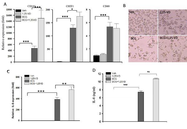 Figure 4: 1,25-VD promotes BCG induced THP-1 differentation/maturation. (A) THP-1 cells were treated with vehicle, 1.25-VD, BCG, or combination overnight. Cells were collected for total RNA extraction. The gene expression levels of macrophage markers, CD163, CHIT1, and CH68 were determined by real-time PCR assay. (B) Representative photos display a morphological alteration after treatments were shown. (C) The expression of IL-8 after the treatment was detected by the real-time PCR and ELISA assays.