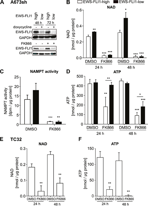 Figure 1: NAMPT inhibition by FK866 reduces NAD and ATP in EwS cells A673sh and TC32. A. Addition of doxycycline in A673sh cells allows for switching from high (EWS-FLI1-high, EFH) to low (EWS-FLI1-low, EFL) EWS-FLI1 expression levels. A673sh were doxycycline (dox) treated or not and protein lysates were obtained and immunoblotted after 48 h and 72 h induction of the shRNA against EWS-FLI1 (upper blot). 24 h after dox addition, cells were treated with 2 nM FK866 or solvent (DMSO) for 24 or 48 h (lower blot). Western blots shown are representative pictures demonstrating efficacy of doxycycline-induced EWS-FLI1 knockdown, and illustrate that FK866 does not interfere with EWS-FLI1 expression. B. NAD content in EFH and EFL (48 h / 72 h dox) A673sh cells after 24 h and 48 h of 2 nM FK866 treatment. C. NAMPT activity was determined from cell lysates of EFH and EFL (48 h dox) after application of 5 nM FK866 for 24 hours. D. ATP content in EFH and EFL (48 h / 72 h dox) A673sh cells after 24 h and 48 h of 2 nM FK866 treatment. E. NAD and F. ATP abundance in TC32 EwS cells before and after addition of 2 nM FK866 or DMSO for 24 h and 48 h. Results were normalized to total protein amount in each sample and cells were cultivated in medium + 10% FCS. DMSO was used as vehicle/control. Data illustrate the means ± SD of a minimum of three independent experiments (*P<0.05, **P<0.01, ***P<0.001).