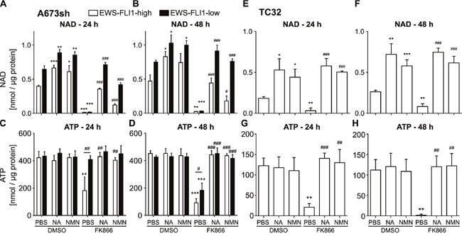 Figure 2: Supplementation with metabolites of the NAD salvage pathway can restore NAD and ATP levels after NAMPT inhibition. A-B. NAD and C-D. ATP levels in A673sh cells which were treated with 25 μM NA or 500 μM NMN (dissolved in PBS) 6 h before and throughout the addition of 2 nM FK866 for 24 h (A & C) and 48 h (B & D) in EFH and EFL (48 / 72 h dox) conditions. Cells were cultivated in serum-containing medium and DMSO-vehicle served as control for FK866 treatment. E-F. NAD and G-H. ATP content in TC32 cells with supplementation of NA and NMN (as described above) and treatment with 2 nM FK866 for 24 h or 48 h. Results were normalized to total protein amount and data represent the means ± SD of a minimum of three independent experiments (*P<0.05, **P<0.01, ***P<0.001 compared to DMSO-PBS; #P<0.05, ##P<0.01, ###P<0.001 compared to FK866-PBS).
