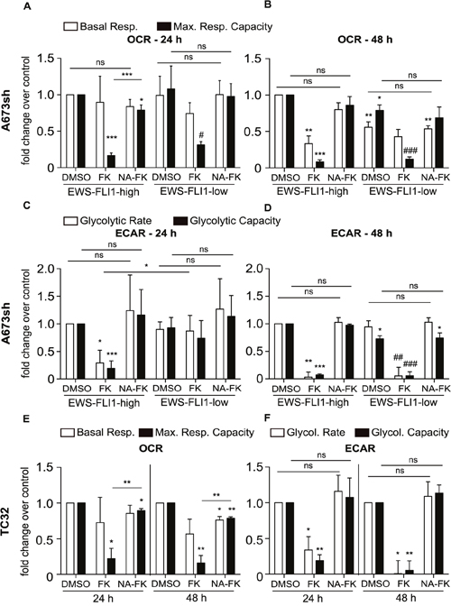 Figure 3: Bioenergetic profiles of EFH and EFL A673sh and of TC32 cells. O2 consumption rates (OCR) and extracellular acidification rates (ECAR) were measured in real time and after injection of mitochondrial / glycolytic inhibitors as described in “Materials and Methods”. A-D. 1×104 A673sh cells were seeded and treated with doxycycline for 17 h the next day. Cells were pre-treated with 25 μM NA (NA-FK) on the following day for 6 h before and throughout the addition of 2 nM FK866 (FK) for a period of 24 h (A & C) or 48 h (B & D). The results were normalized to total protein after measurement. Basal respiration (BR) and maximal respiratory capacity (MRC) as well as glycolytic rate (GR) and glycolytic capacity (GC) data were normalized to DMSO-EFH and displayed as fold change over control. E-F. 9×103 TC32 cells were seeded and pre-treated with 25 μM NA (NA-FK) on the following day 6 h before and throughout the addition of 0.4 nM FK866 (FK) for a period of 24 h (E) or 48 h (F). The results were normalized to total protein after measurement. BR, MRC, GR, and GC results were normalized to the respective DMSO-vehicle control (24 h or 48 h) and displayed as fold change over control. Data are represented as the means ± SD from a minimum of three independent replicates (*P<0.05, **P<0.01, ***P<0.001 compared to DMSO-EFH; #P<0.05, ##P<0.01, ###P<0.001 compared to DMSO-EFL, ns: not significant).