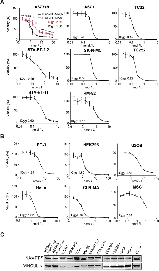 Figure 5: FK866 decreases cell viability in a sub-nanomolar range in EwS cells. Dose-response curves to FK866 treatment and determination of IC50 values for A. A673sh cell clone at EFH and EFL conditions, A673 parental cell line and six additional EwS cell lines harboring different EWS-FLI1 and EWS-ERG fusion types (Supplementary Table 1) and B. six non-EwS cell types: PC-3 (prostate cancer), HEK293 (kidney), HeLA (cervical carcinoma), CLB-MA (neuroblastoma), U2OS (osteosarcoma), and MSCs. 4×103 A673sh cells were seeded in each well of 96-well plates, treated or not with doxycycline the next day, and were compound treated for additional 72 h starting 24 h after doxycycline administration. 1-1.2×104 cells of the other non-inducible cell lines were seeded in 96-well plates and treated with FK866 for 72 h the next day. Data represent the means ± SD from a minimum of three independent experiments (*P<0.05, **P<0.01, ***P<0.001). C. Immunoblot analysis for NAMPT expression (arrow) in different EwS and Non-EwS cell lines. Protein band for EWS-FLI-low band shows cells after 48 h doxycycline treatment. Vinculin was used as loading control.