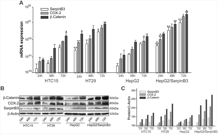 Figure 5: Profile of expression of SerpinB3, COX-2 and β-Catenin in cell lines. A. In HTC15, HT29, HepG2 and HepG2/SerpinB3 cell lines SerpinB3, COX-2, and β-Catenin transcripts were quantified at 24, 48 and 72 hours after plating by real-time PCR. Results are expressed as mean +/- SE of three independent experiments. SerpinB3: HTC15 cell line 24hr versus 72hr *p = 0.0376 and 48hr versus 72hr *p = 0.0376; HT29 cell line 24hr versus 48hr **p = 0.0018, 24hr versus 72hr *p = 0.0181 and 48hr versus 72hr *p = 0.0134; HepG2/SerpinB3 cell line 24hr versus 48hr ***p < 0.0001, 24hr versus 72hr **p = 0.0014 and 48hr versus 72hr **p = 0.0028. COX-2: HT29 cell line 24hr versus 48hr ▪▪p = 0.0098, 24h versus 72h ▪p = 0.0316 and 48h versus 72h ▪p = 0.0103; HepG2 cell line 24h versus 72hr ▪p = 0.0180; HepG2/SerpinB3 cell line 24hr versus 48hr ▪▪▪p = 0.0002, 24hr versus 72hr ▪▪p = 0.0023. β-Catenin: HTC15 cell line 24hr versus 72hr •p = 0.0421; HT29 cell line 24hr versus 48hr ••p = 0.0047, 24hr versus 72hr ••p = 0.0065 and 48hr versus 72hr •p = 0.0201; HepG2 cell line 24hr versus 72hr •p = 0.0300; HepG2/SerpinB3 cell line 24hr versus 48hr •••p = 0.0004 and 48hr versus 72hr ••p = 0.0024. B. SerpinB3 (45 KDa), COX-2 (60 KDa) and β-Catenin (92 KDa) proteins were analyzed by Western blot and C. Their levels were estimated by densitometric analysis (QuantityOne software, Biorad). β-Actin expression was used for sample normalization. Results are representative of three independent experiments.