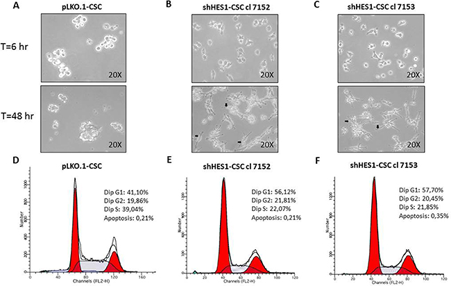 Figure 2: Targeting Hes1 expression induces morphological changes and negatively affects the cell cycle profile in shHes1-CSC. (A–C) Phase-contrast images captured at 200× magnification after 6hs and 48hs in growth conditions, reveal substantial cell changes with attachment of shHes1-CSC on plastic dishes and formation of neuron-like cells (arrows in B,C), contrary to pLKO.1 cells which formed classical not-adherent neurospheres. (D–F) FACS analyses of cell cycle profiles reveal a substantial shift from S phase to G1 fraction of shHes1-CSC clones compared to pLKO.1 cells. Data of flow cytometry are representative of two independent experiments. The difference of percentages in cell cycle distribution between cell clones and p-LKO.1-CSC is consistent and can be considered biologically significant.