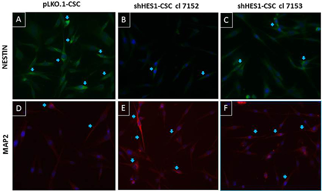 Figure 3: Modulation of neural differentiation in shHes1-CSC by immunofluorescence assay. (A–C) Immunostaining for Nestin reveals its upregulation in control cells vs Hes1-depleted cells (arrows). (D–F) Immunostaining for MAP2 reveals its upregulation in Hes1-depleted cells vs control cells (arrows). Images were captured at 400X magnification.