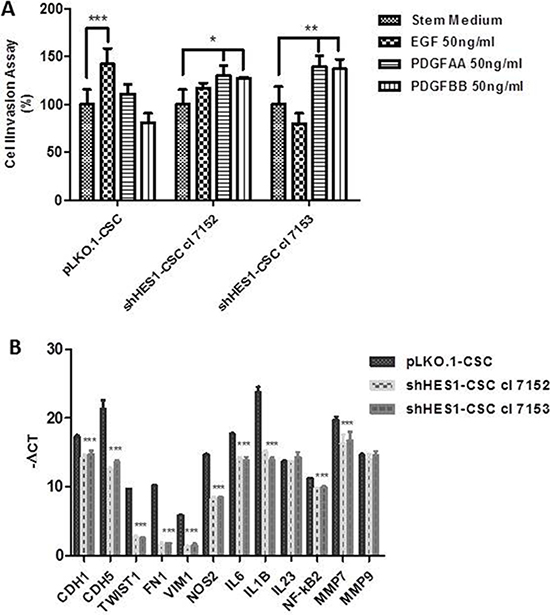 Figure 4: Targeting Hes1 impairs cell invasive abilities, modulates epithelial mesenchymal transition and inflammatory cytokines gene expression. (A) Addition of EGF promoted a significant migration of pLKO.1 cells in cell invasion assay compared to stem medium, contrary to that occurs in shHes1-CSC. PDGFAA and PDGFBB promoted a significant migration of shHes1-CSC clones in comparison to stem medium, instead pLKO.1-CSC are not significantly influenced by PDGFAA and PDGFBB. Error bars represent the mean ± SD of two independent experiments performed in triplicate. *P values < 0.05, **P < 0.01**, ***P < 0.001 vs. control stem medium were considered statistically significant. (B) RT-qPCR analyses of key genes for angiogenesis, EMT, immunomodulation and cell invasion. mRNA expression for cell-substrate molecules interaction (CDH1, CDH5) were drastically downmodulated in shHes1-CSC vs pLKO.1 cells. Few EMT markers (TWIST1, FN1, VIM), together with immunomodulators (NOS2, IL6, IL1B, IL23, NF-κB2) and matrix metalloproteinases (MMP7, MMP9) were similarly downmodulated in shHes1-CSC in comparison to pLKO.1 cells.
