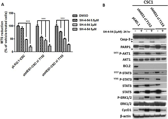 The extensive detrimental effects produced by Hes1 depletion were not followed by CSC apoptosis. To reach this objective, we targeted Stat expression by using SH-4–54, a Stat3/5 small inhibitor. MTS assays were used to test the drug sensitivity of shHes1-CSC vs pLKO.1. shHes1-CSC were significantly sensitized at 0.5 μM of SH-4-54 compared to pLKO.1 after 1 day of treatment. Higher concentrations of SH-4-54 (2–5 μM) progressively prone CSC to cell death as seen by light microscope (data not shown) and MTS reduction output (Figure 5A). We used SH-4-54 at the intermediate dose, which reduced cell viability at fifty percent, to perform Western blots analysis. After 24 hs of SH-4-54 treatment, Stat3 and Stat5 proteins stability and activity were abolished (Figure 5B). SH-4-54 treatment was able to induce Caspase-3 activation (19-17 KDa) and PARP1 (116-89 KDa) fragments, and even anti-apoptotic signals such as P-Akt (S473) and P-Erk1/2 (T202-Y204), Bcl2 and CyclinD1 declined drastically (Figure 5B).