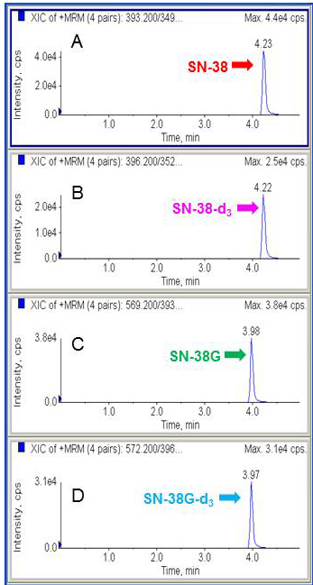 Figure 1: Representative chromatograms of SN-38, SN-38-d3, SN-38G and SN-38G-d3. Peak of SN-38 A. Peak of SN-38 internal standard using isotopic sister of the analyte, SN-38-d3 B. Peak of SN-38G C. Peak of SN-38G internal standard, SN-38G-d3 D.