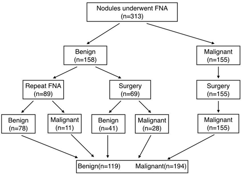 All of 313 nodules had follow-up US-guided FNA or thyroid surgery after cytologic diagnosis results. The final benign or malignant results of follow-up US-guided FNA or thyroid surgery was used as the gold standard in this study.