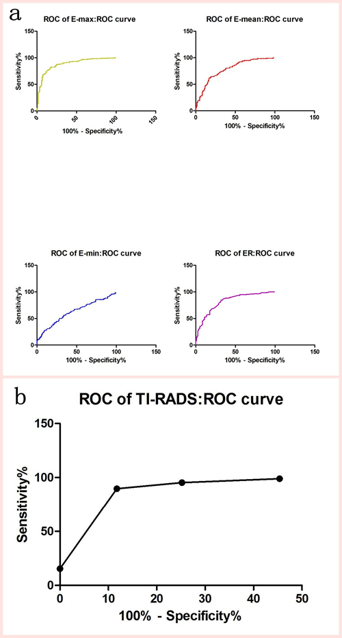 The great prevalence of TND makes the distinction between benign and malignant lesions a vital problem in endocrinology. Sonographic appearance is very helpful for the diagnosis and management of malignant and benign nodules [27-29]. SWE is a novel technique with high sensitivity and specificity in the evaluation of TND and can potentially reduce unnecessary fine-needle aspiration biopsies [30]. Liu et al. [31] demonstrated that SWE was helpful in predicting malignant thyroid nodules with comparable results. Consistent with previous studies, we also proved that the EIs of SWE had very significant differences in differentiating benign and malignant thyroid nodules (P < 0.001).