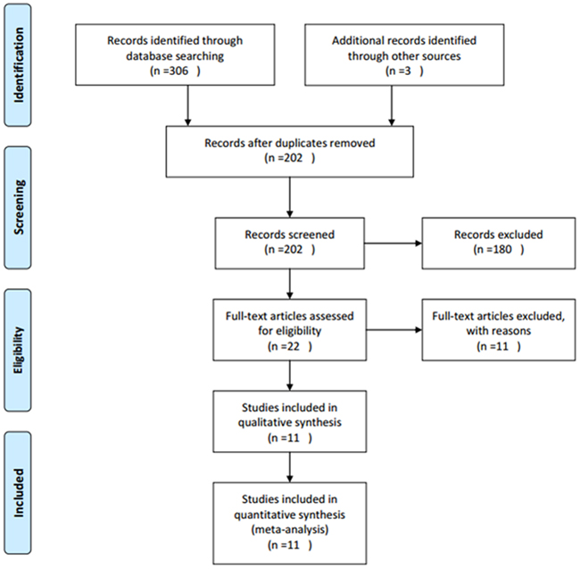 A total of 202 studies were identified through systematic literature searching. After title and/or abstract screening, 22 full-text articles were evaluated for eligibility. Then, 11 articles were excluded for: 2 papers were duplicate studies, 1 paper was a comment and 8 studies lacked key information. At last, 11 studies [14–24] published from 2007 to 2015 with 1,697 patients were included in meta-analysis. The literature selection process was shown in Figure 1. All studies were retrospective study design and detected survivin expression using IHC. Five studies [14, 18, 21, 23, 24] were from Asian countries and six studies [15–17, 19, 20, 22] were from western countries. The sample size ranged from 42 to 634. The basic features of these studies were shown in Table 1.